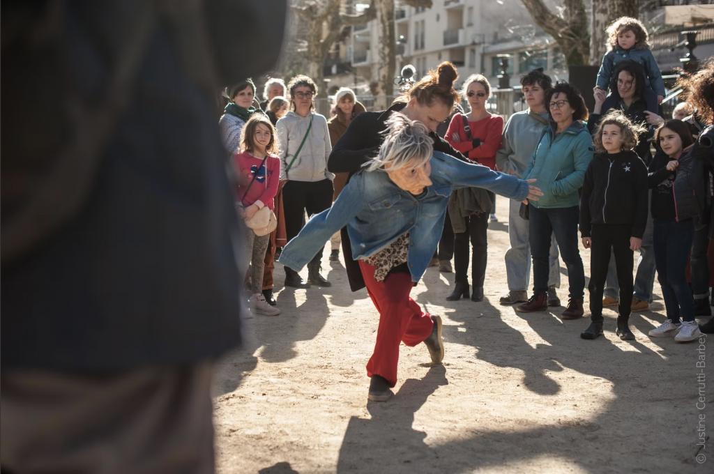 Le public, au centre de la place, est amené à se réorienter pour suivre une mosaïque de scènes oscillant entre réel et fantastique.