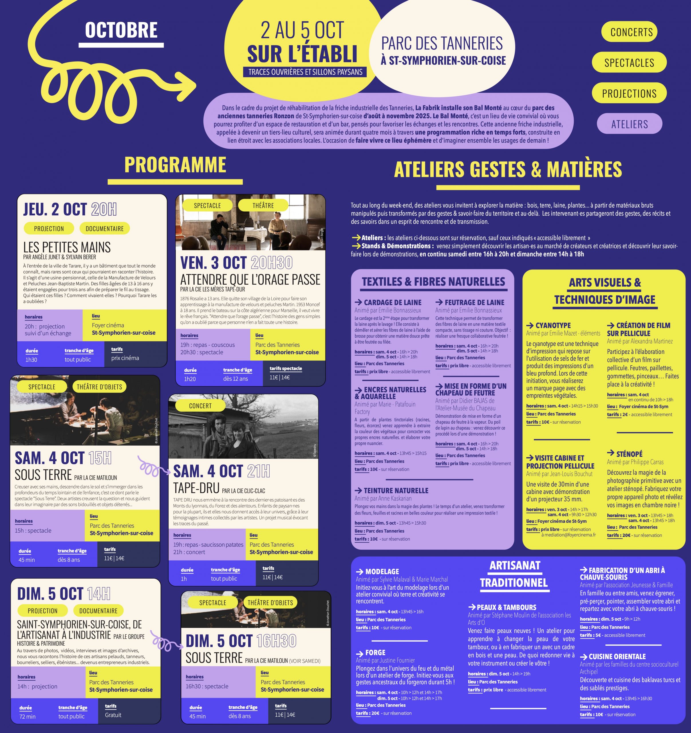 Le Parc des Tanneries de St-Symphorien-sur-coise accueille le temps fort « Sur l’établi – Traces ouvrières et sillons paysans » : 4 jours de rencontres, spectacles, concerts, projections et ateliers autour des savoirs-faire, de la mémoire ouvrière et des gestes paysans. Un moment festif et créatif pour explorer la matière, partager des histoires et célébrer un patrimoine vivant.